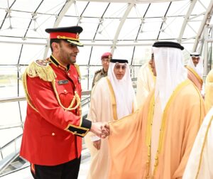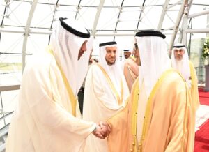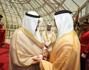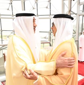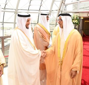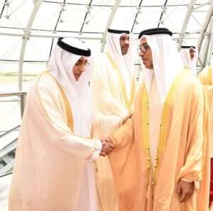 ويرافق سموه وفد رسمي يضم معالي الشيخ نهيان بن مبارك آل نهيان وزير التسامح والتعايش ومعالي عبدالرحمن بن محمد العويس وزير الصحة ووقاية المجتمع ووزير دولة لشؤون المجلس الوطني الاتحادي ومعالي سهيل محمد المزروعي وزير الطاقة والبنية التحتية ومعالي الدكتور سلطان أحمد الجابر وزير الصناعة والتكنولوجيا المتقدمة ومعالي شما سهيل المزروعي وزيرة تمكين المجتمع ومعالي سارة يوسف الأميري وزيرة التربية والتعليم ومعالي عبدالله سلطان عواد النعيمي وزير العدل ومعالي محمد حسن السويدي وزير الاستثمار ومعالي خليفة شاهين المرر وزير دولة وعدد من كبار المسؤولين في حكومة دولة الإمارات العربية المتحدة الشقيقة