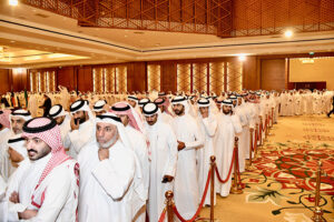 بحضور سمو الشيخ ناصر المحمد احتفل شيخ قبيلة بني هاجر محمد بن راشد بن شبعان بزفاف عبد الرحمن بن محمد وراشد بن نمر، بفندق الجميراـ شاطئ المسيلة ـ قاعة بدرية.