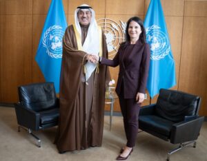 التقى ممثل سمو أمير البلاد الشيخ مشعل الأحمد الجابر الصباح، سمو ولي العهد الشيخ صباح خالد الحمد الصباح، برئيسة الجمعية العامة للأمم المتحدة أنالينا بيربوك على هامش أعمال اجتماعات الدورة الـ80 للجمعية العامة للأمم المتحدة.