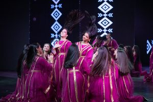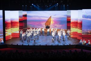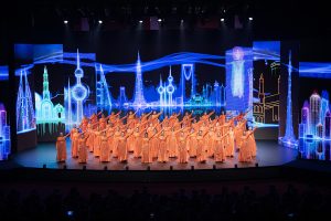 واستهل الحفل بالسلام الوطني بعدها بدأ الأوبريت الوطني حيث قامت مجموعات من طلاب وطالبات المراحل الدراسية المختلفة من مدارس وزارة التربية بتقديم لوحات فنية متنوعة عكست مشاعر حب الوطن والانتماء والولاء له كما جسدت معاني “ديرة الخير” بما يحمله وطننا الغالي من عطاء متواصل واحتضان لأبنائه وقدرته على تجاوز التحديات عبر مختلف الأزمان وما يميزه حكمة قيادته وتلاحم شعبه.